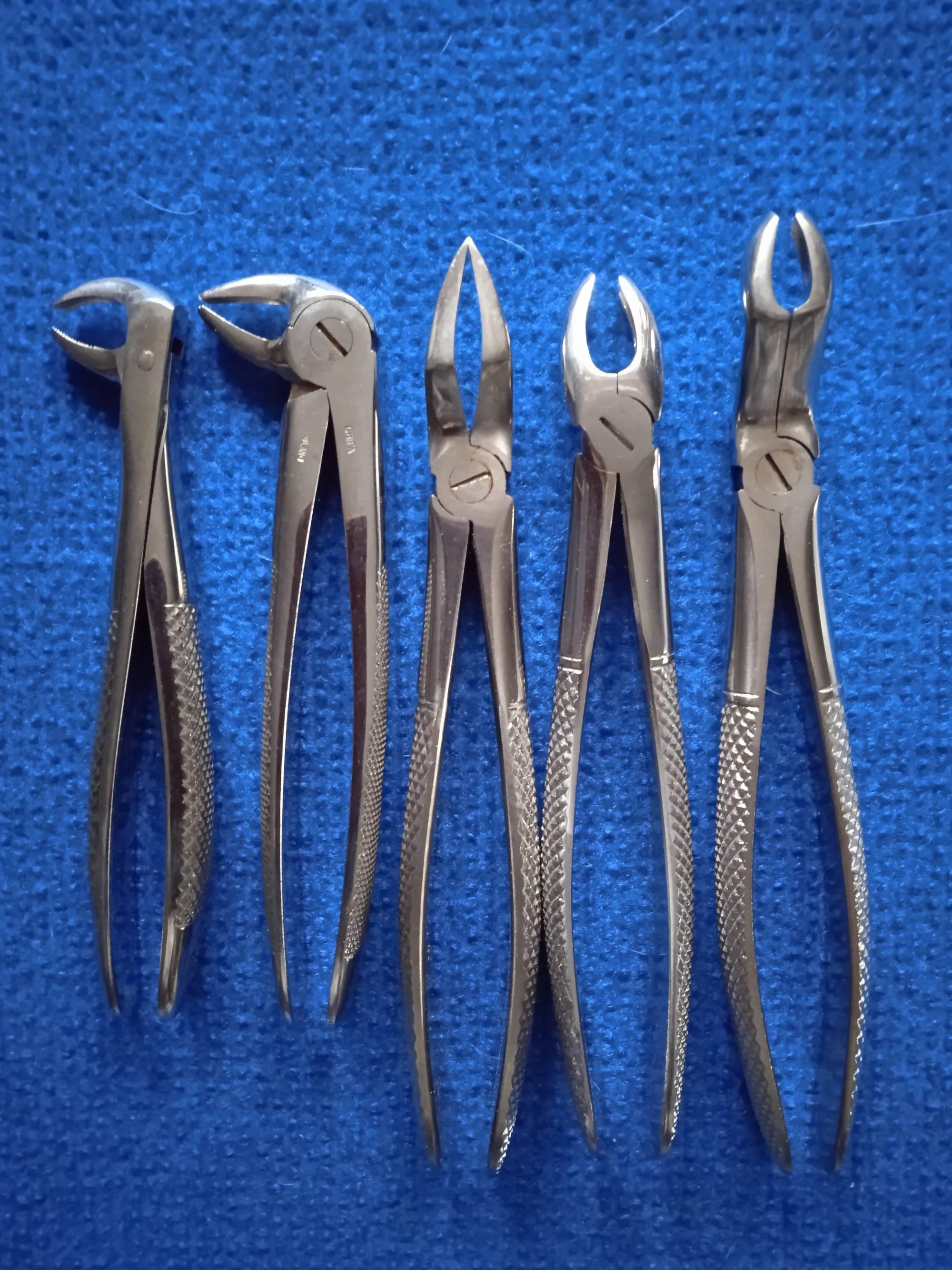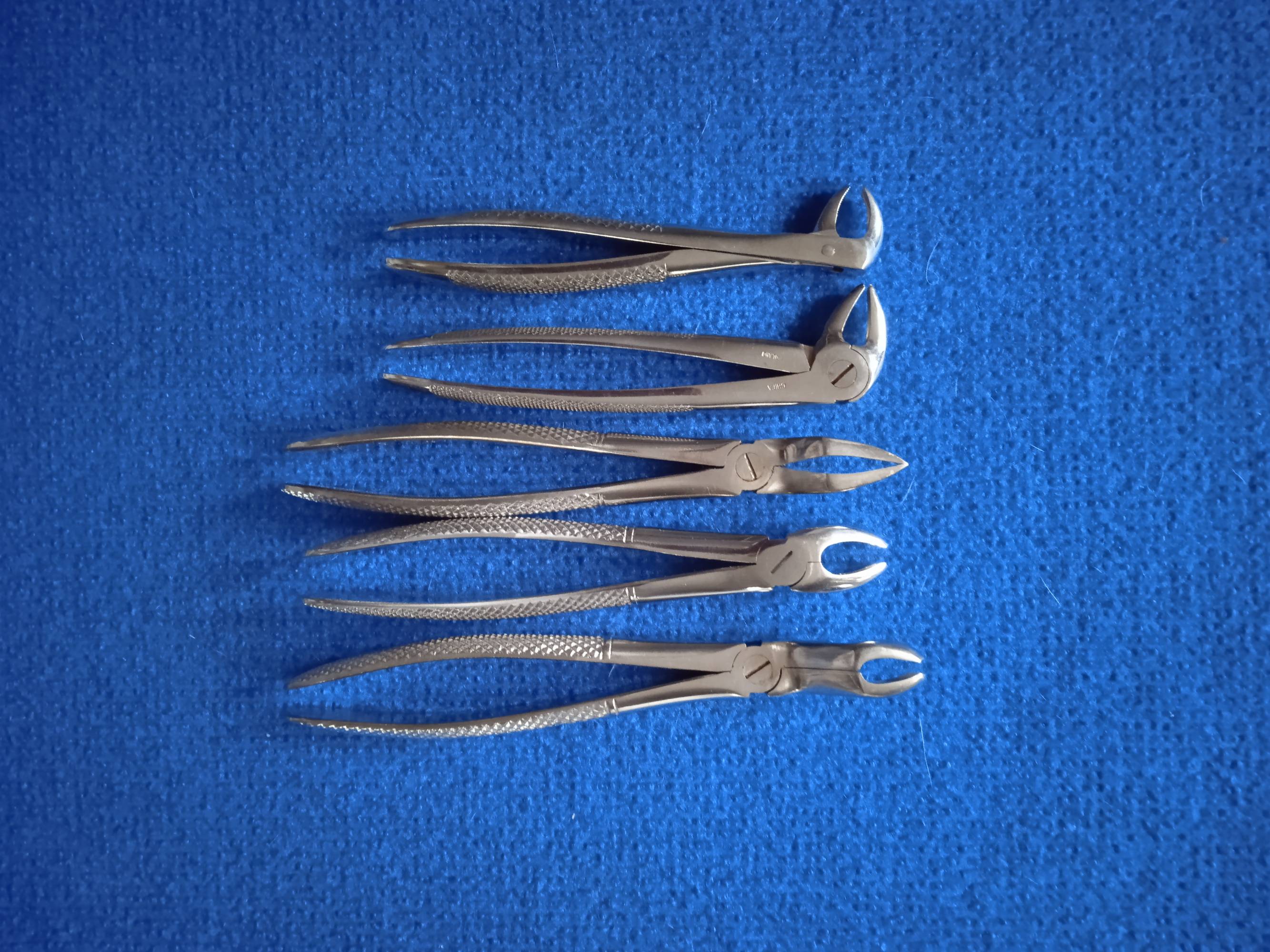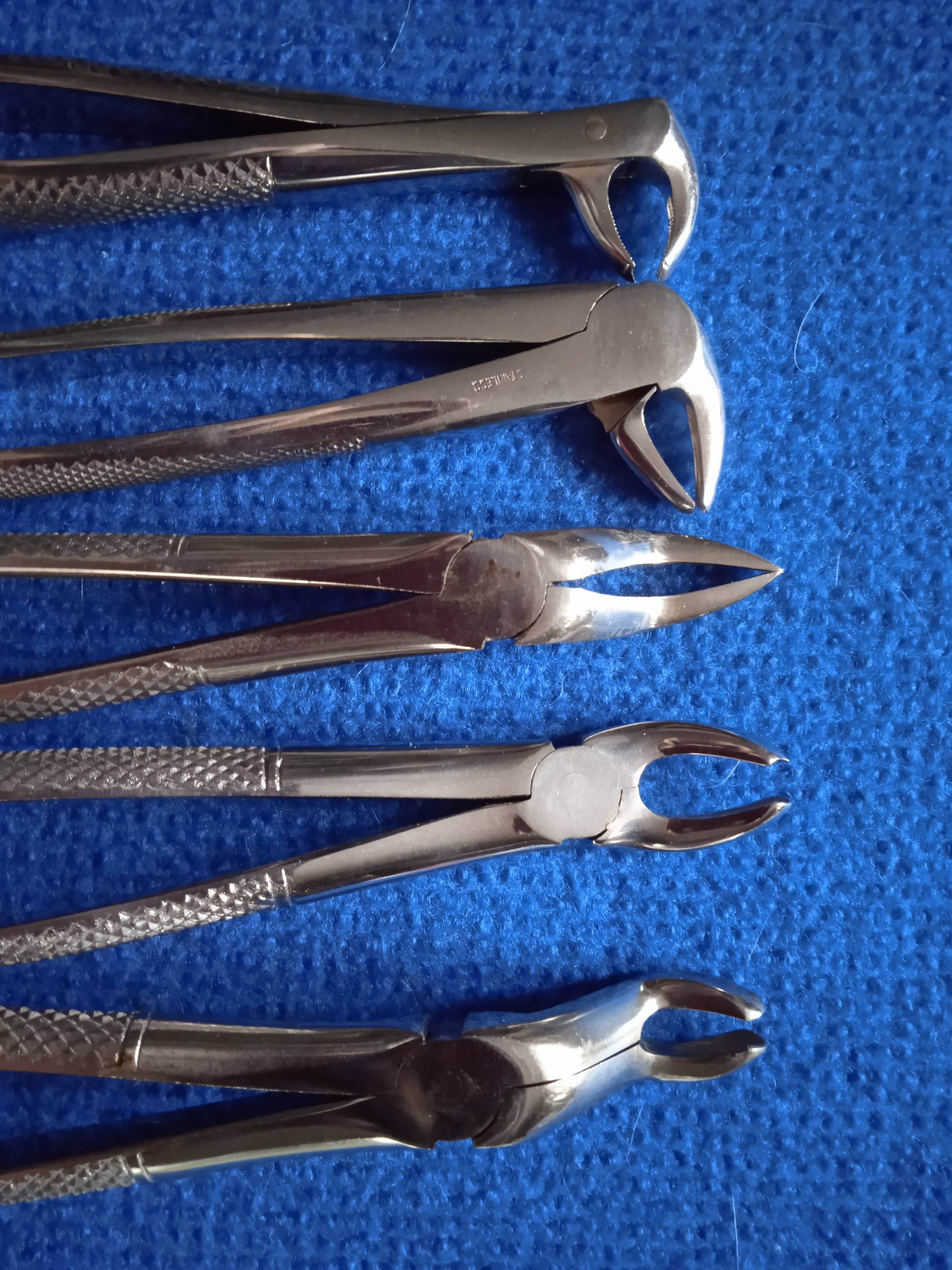 Używane, w bardzo dobrym stanie kleszcze stomatologiczne. W zestawie 5 sztuk.