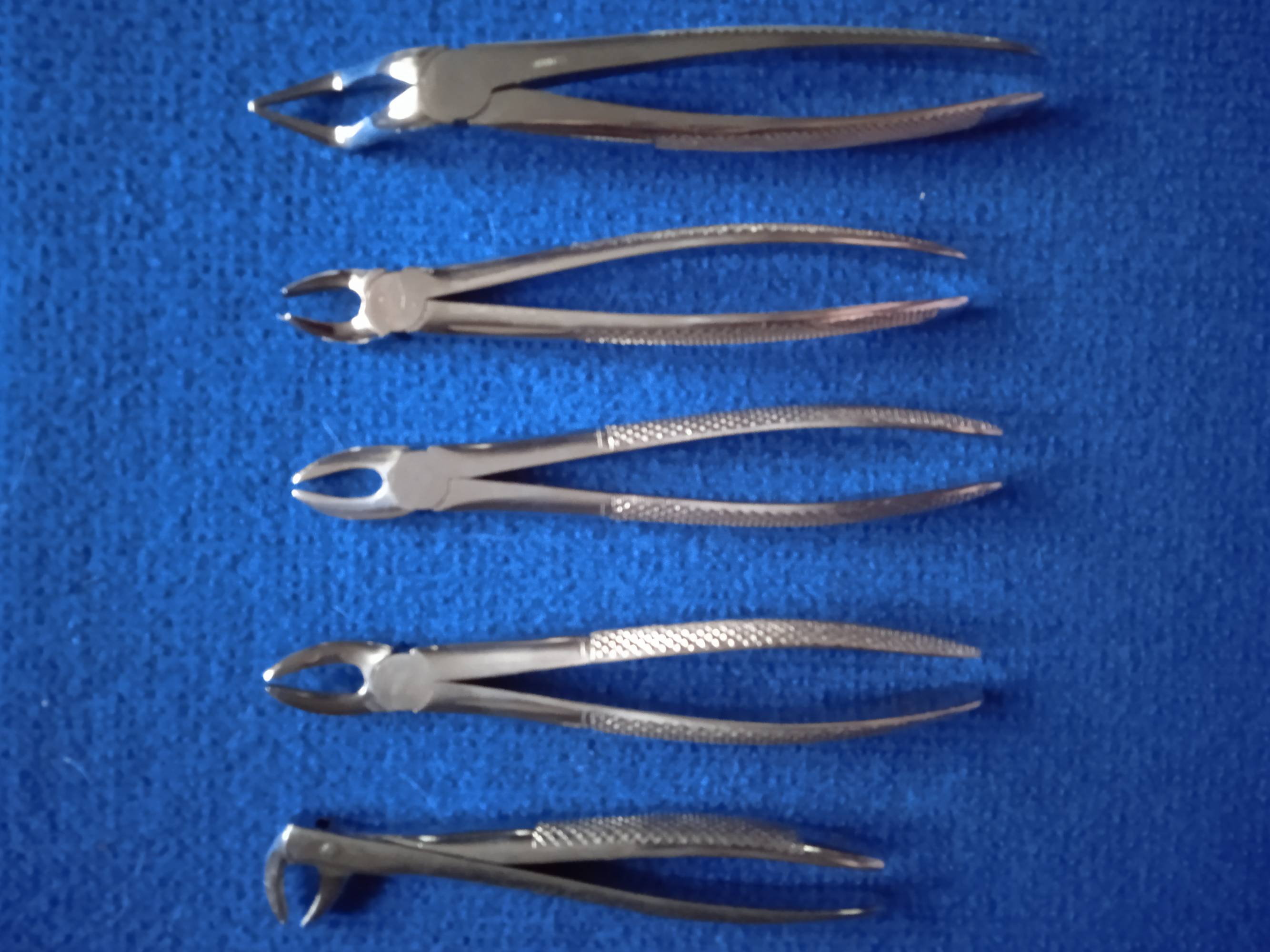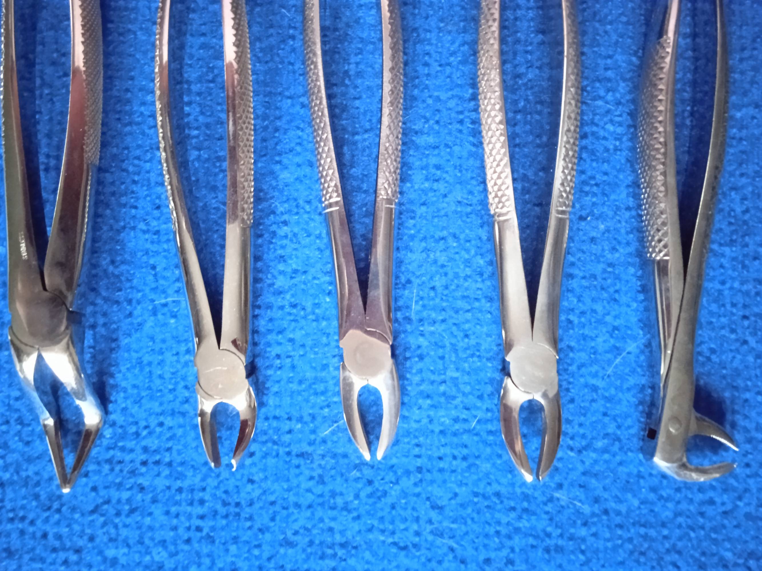 Używane, w bardzo dobrym stanie kleszcze stomatologiczne. W zestawie 5 sztuk.
